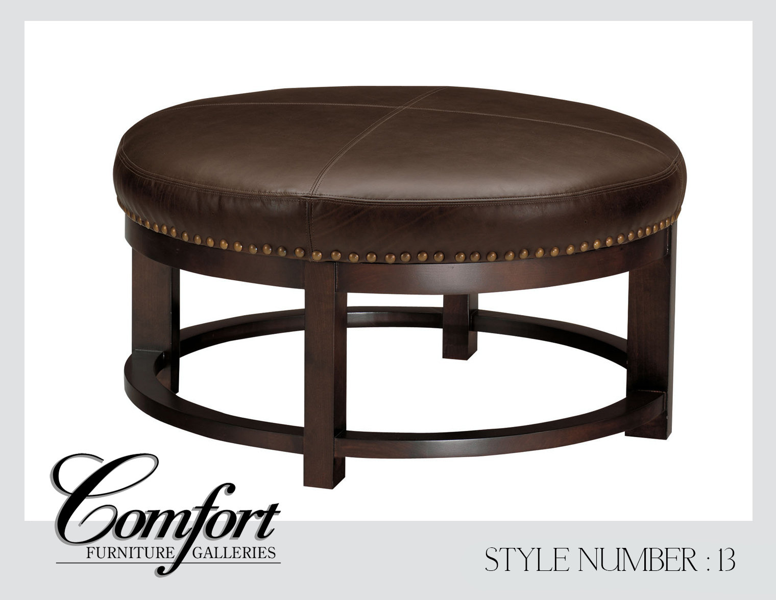 The 13 Ottoman embodies sophisticated elegance with artisanal detail. Upholstered in supple leather or fine fabric, its hand-applied nail head trim adds a touch of timeless refinement. The generously scaled round seat rests on a sculptural open wood base, crafted with clean lines that exude both strength and grace.