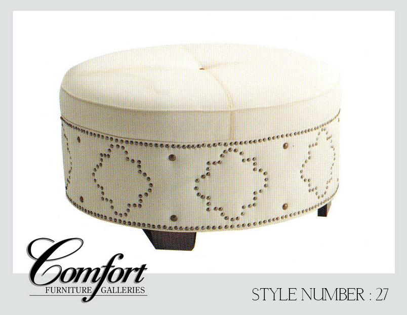 The 27 Ottoman brings a touch of Mediterranean elegance to your home with its beautifully detailed nail head design with 3 sizes and 9 colors. Its round silhouette features a smooth, tailored seat with a single tuft, while the intricate nail head pattern around the base adds a sense of artistry and timeless character. Supported by solid wood legs, it blends durability with refined style.