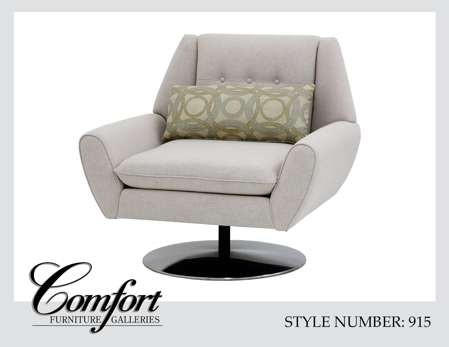 The Style 915 Swivel Chair brings a refined mid-century modern flair with its angled frame, button-tufted back, and tailored seat cushion. Its sleek design is elevated with a smooth swivel base, offering both style and flexibility for modern living. A decorative lumbar pillow adds extra comfort and a touch of visual interest, making it as functional as it is stylish. Perfect for living rooms, lounges, or offices, this chair is designed to have a versatile accent that blends retro character with modern usability.