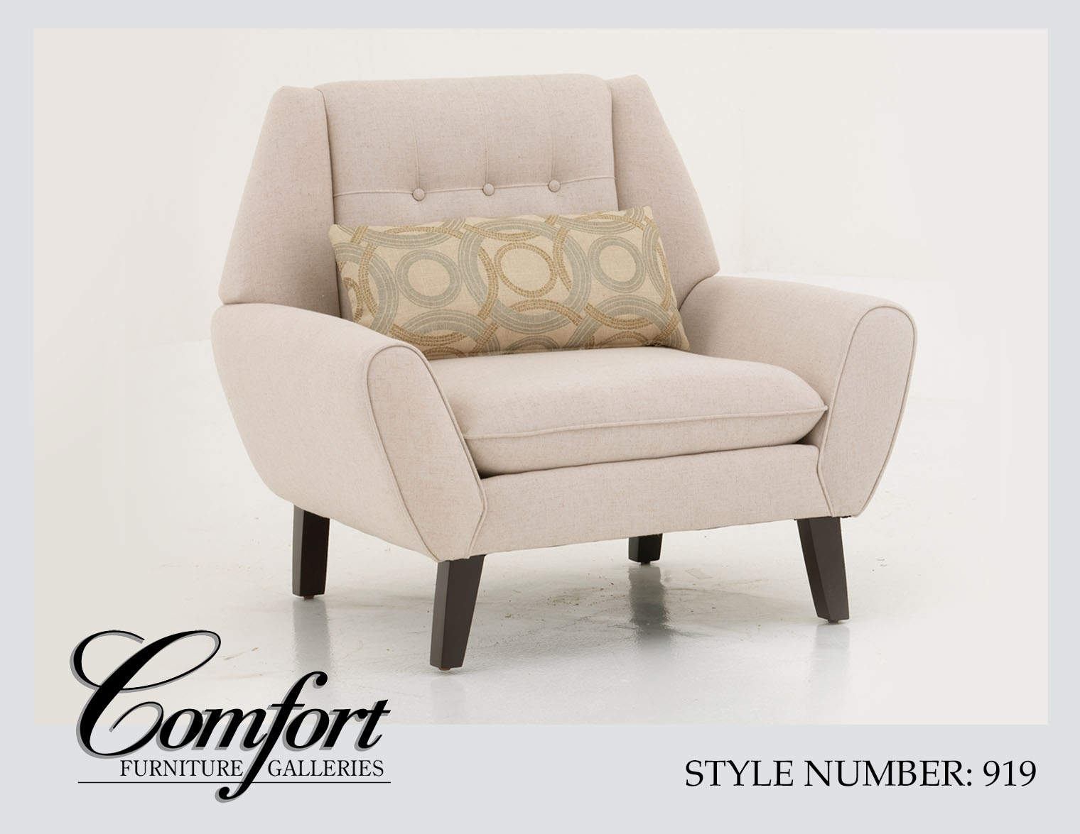The Style 919 Accent Chair captures the essence of mid-century modern design with its clean lines, angled frames and tailored detailing. Its button-tufted backrest, sloped arms, and tapered wood legs bring retro-inspired charm, while the plush seat cushion ensures modern-day comfort. Paired with a decorative lumbar pillow, it offers both support and style in one timeless design. Perfect for living rooms, bedrooms, or home offices, this chair works as a statement piece or as part of a coordinated mid-century ensemble.