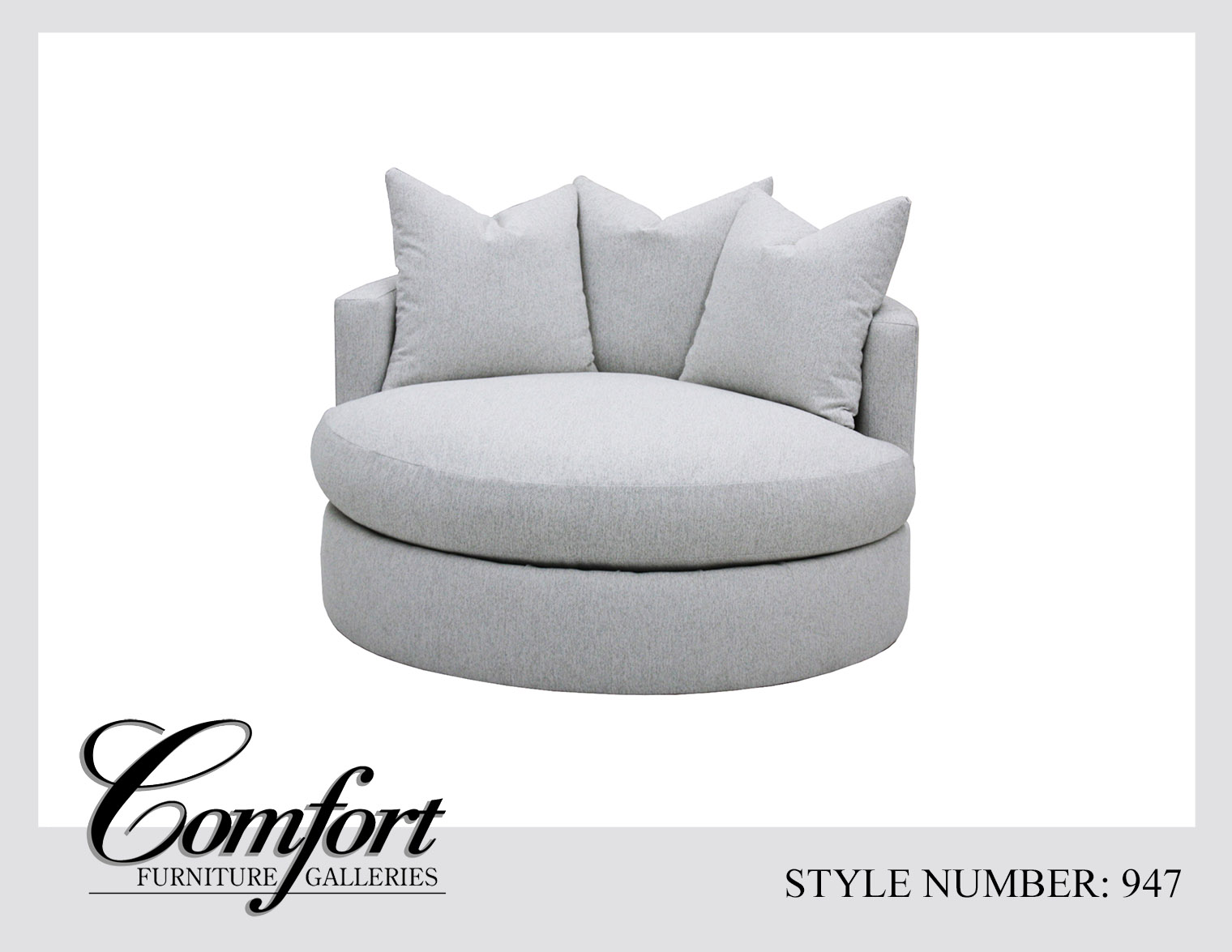 The Style 947 Swivel Chair is a bold and inviting piece designed for ultimate comfort and modern lounging. Its oversized circular frame and plush cushioning come in two sizes and make it the perfect spot to curl up, relax, or share. With three generously sized back pillows and a deep, round seat, it offers both style and coziness in equal measure. Set on a smooth swivel base, this chair provides flexibility and functionality, making it an ideal centerpiece for living rooms, lounges, or media spaces.