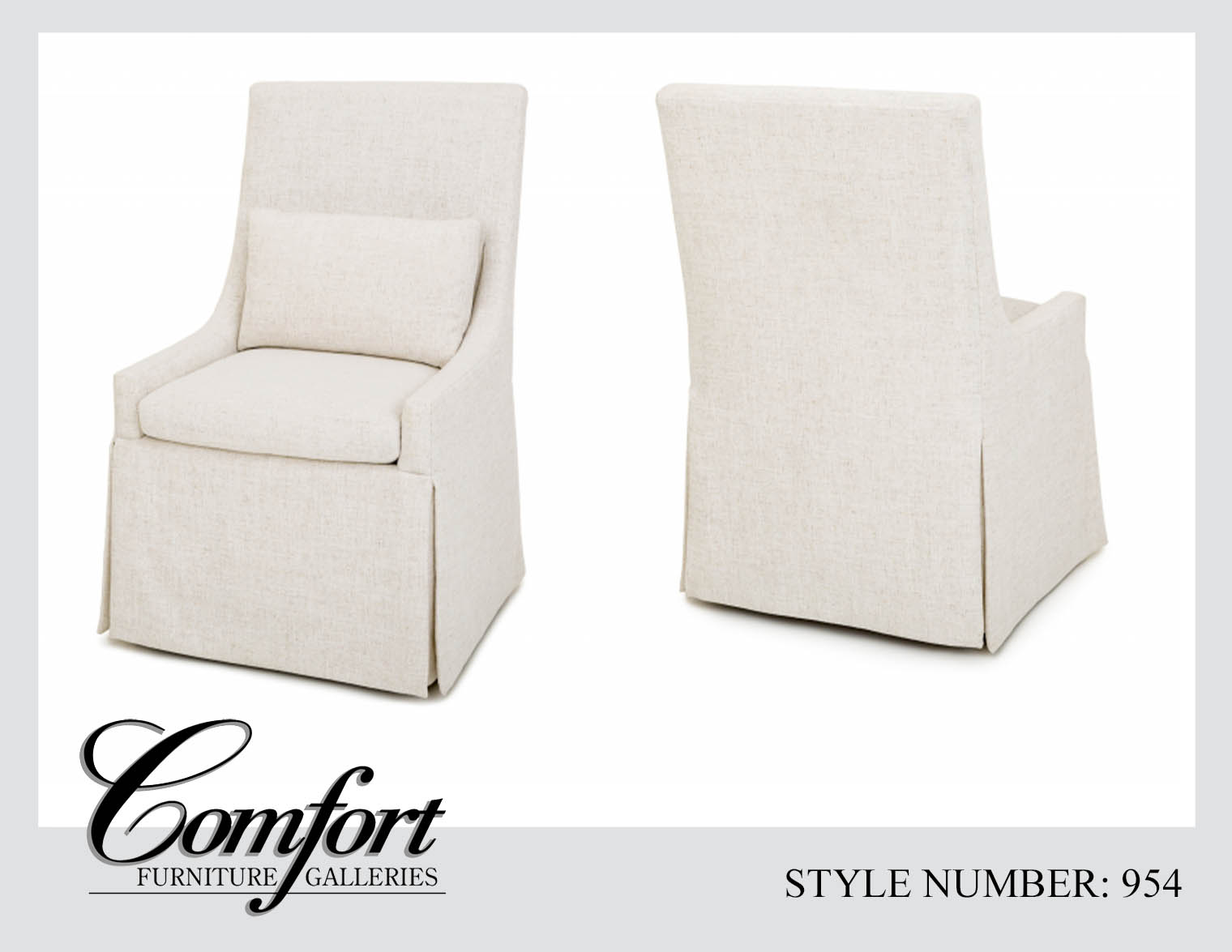 The Skirted Dining/Accent 954 Chair combines classic elegance with modern comfort, making it a versatile choice for both formal and casual settings. With its tall, gently curved back and fully tailored skirt, the design offers a refined look that blends seamlessly into dining rooms, living spaces, or bedrooms. A plush seat cushion and matching lumbar pillow ensure supportive comfort for extended seating.